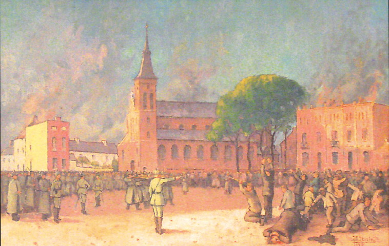 Hiernaast, Het schieten van Tamines, een schilderij van Jean-Baptiste Scoriel (1883-1956). Olieverf op doek. 1942. Eigendom van de gemeente Sambreville.